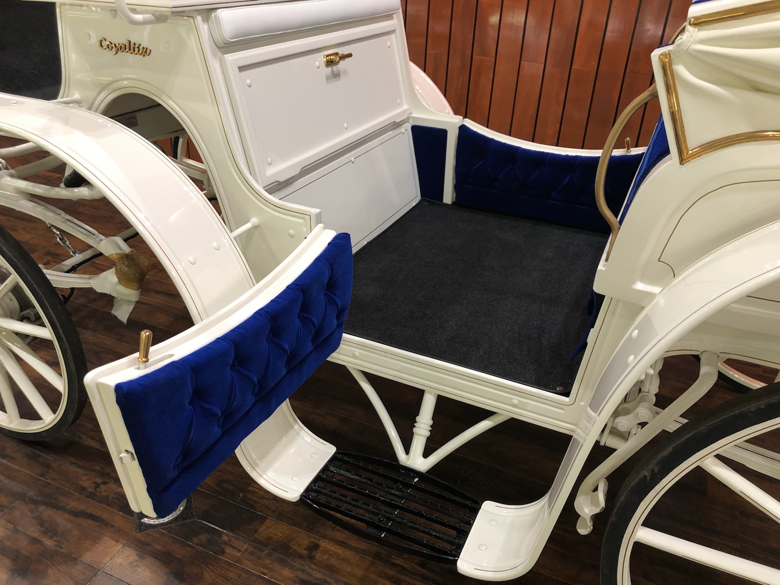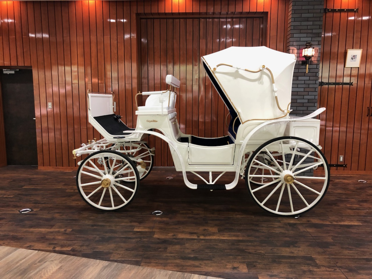 白塗装+金パーツ、ロイヤルブルーのベロア仕様でかっこよく、管理人一押しのウェディング用馬車です。