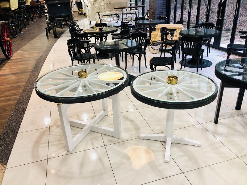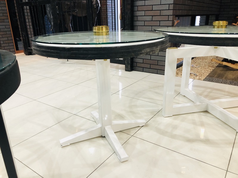 車輪はスチール製/塗装品、天板は強化ガラス製。
