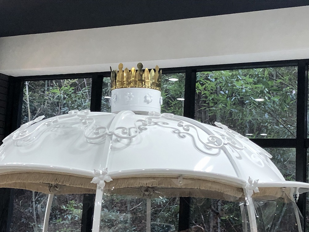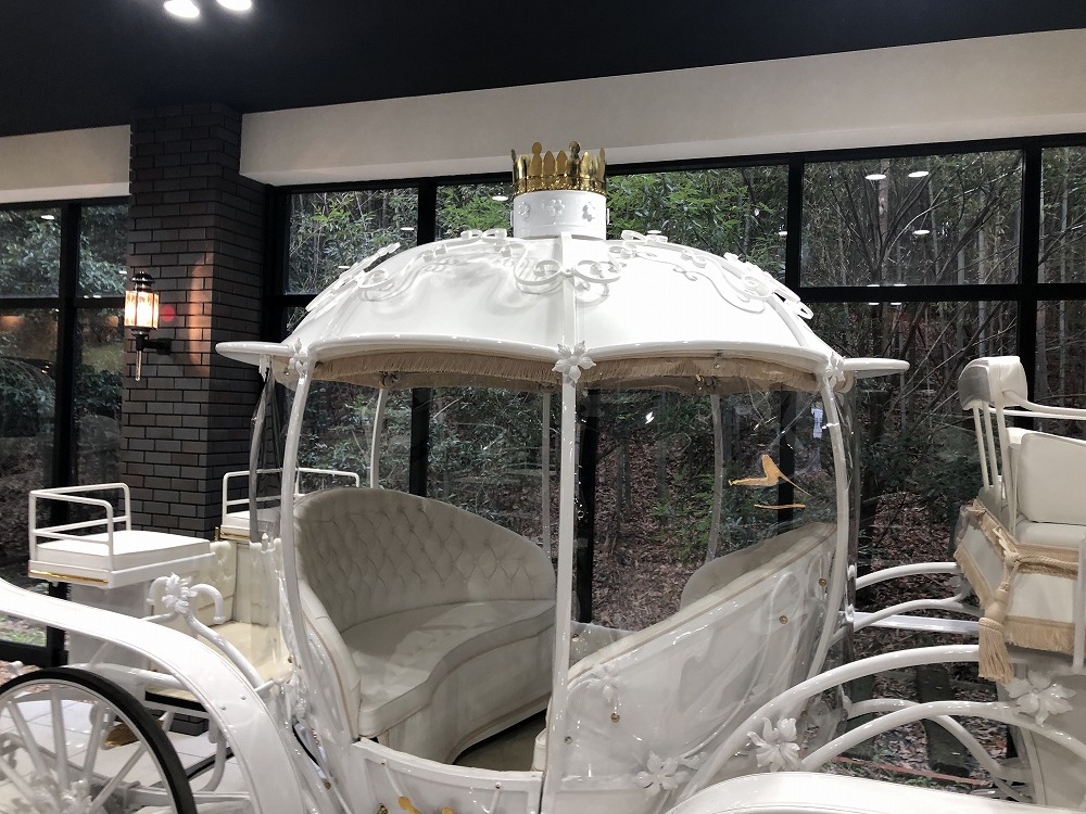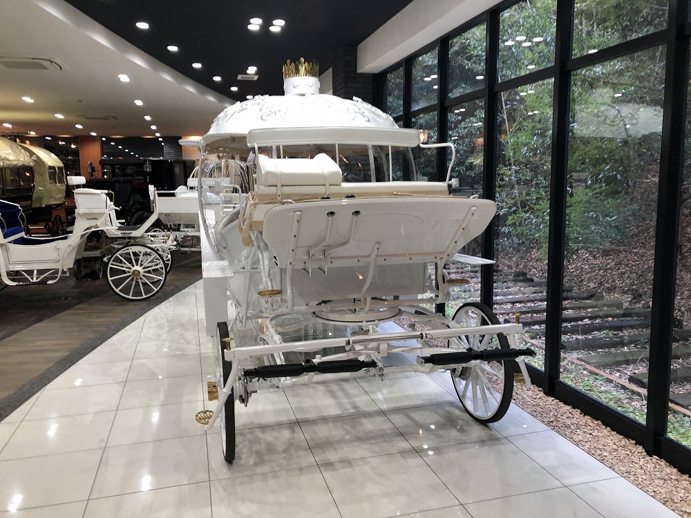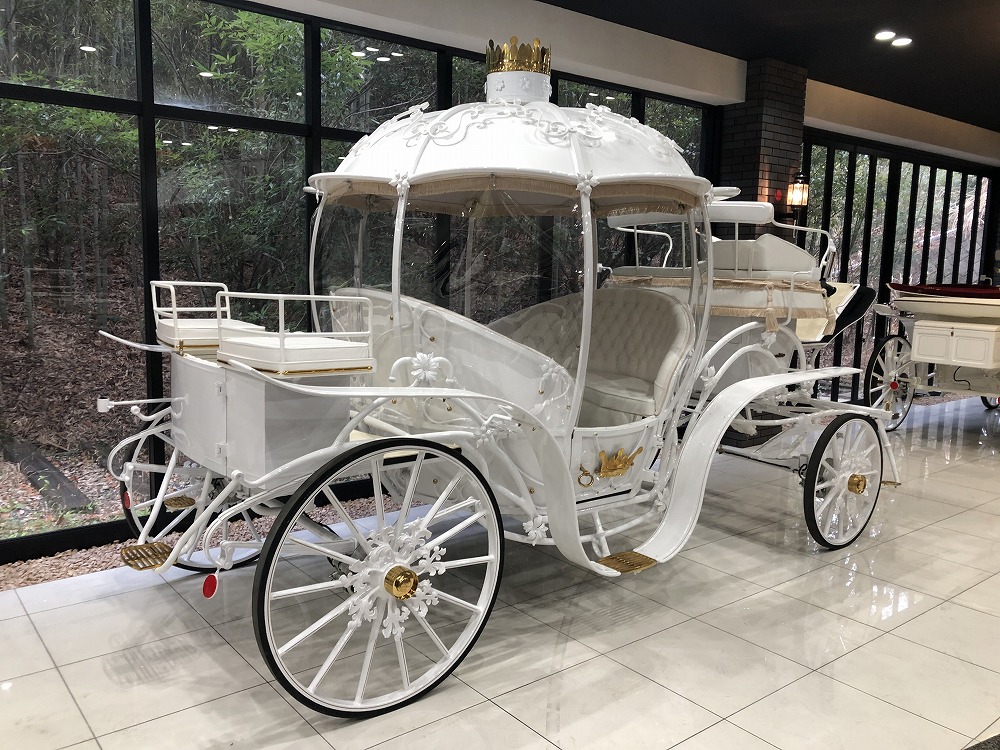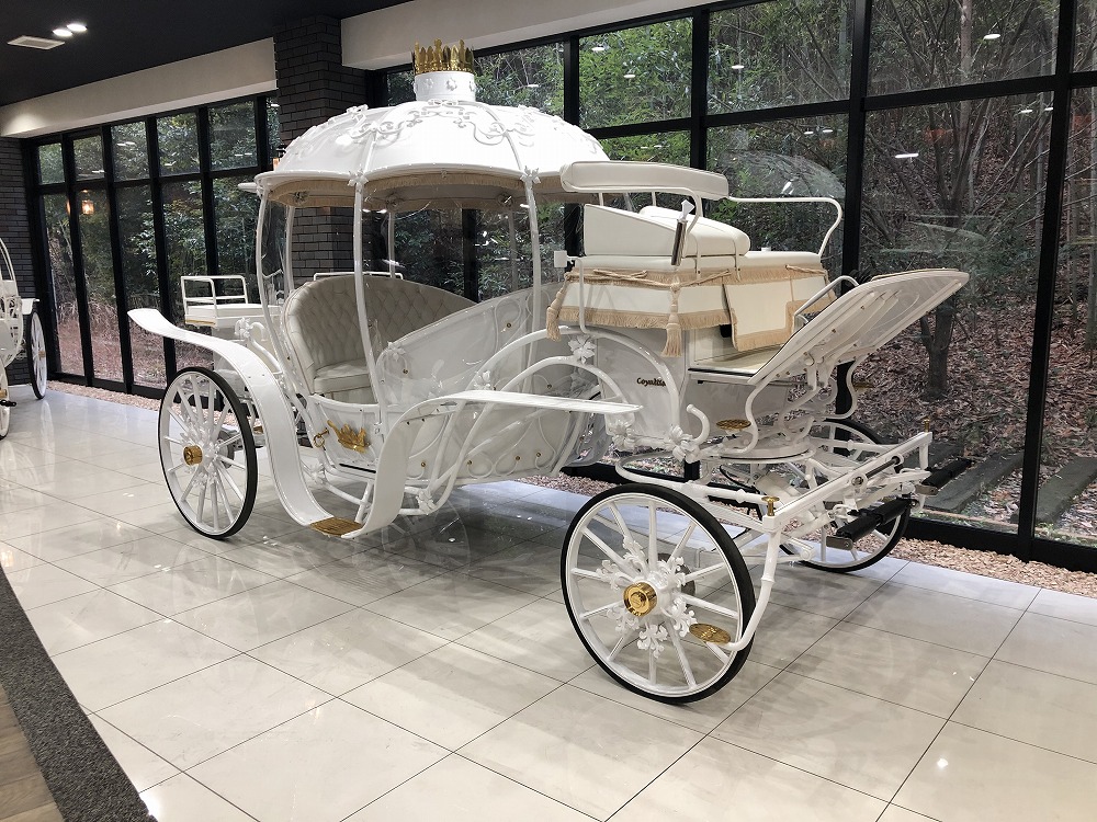 その名もシンデレラ!メーカーのCoyaltix社はディズ●ー映画「シンデレラ」の撮影にも協力したメーカーです。Coyaltix社が制作したシンデレラをイメージしたウェディング馬車の王様級の車両で、当社ショールームでも主(ぬし)として堂々たる風格で鎮座してます。